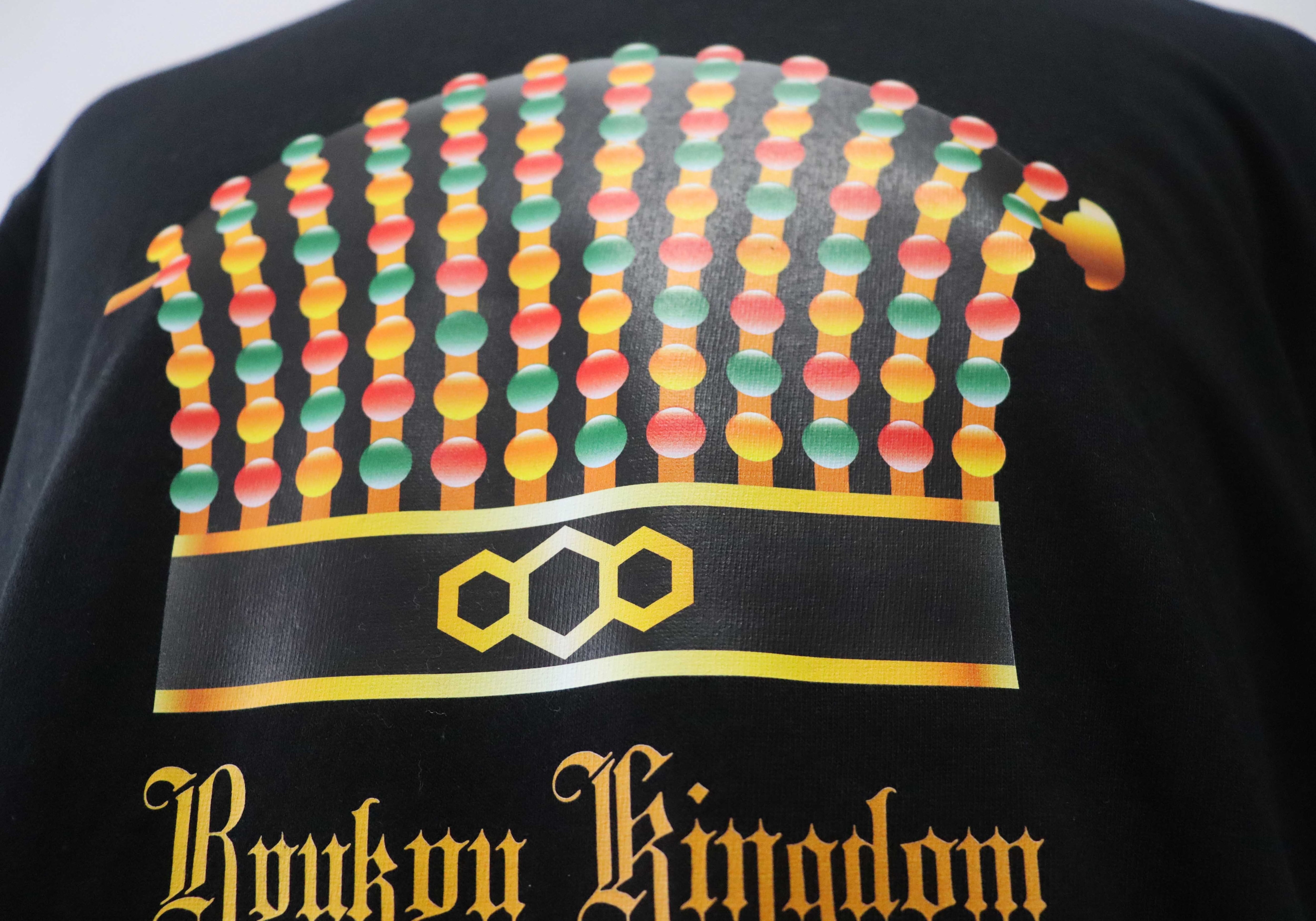 DTFでプリントされた琉球玉冠は、色の深みもあり、玉の透明感、グラデーションが再現できています。Ryukyu Kingdom の細いラインもしっかりグラデーション出来ています。