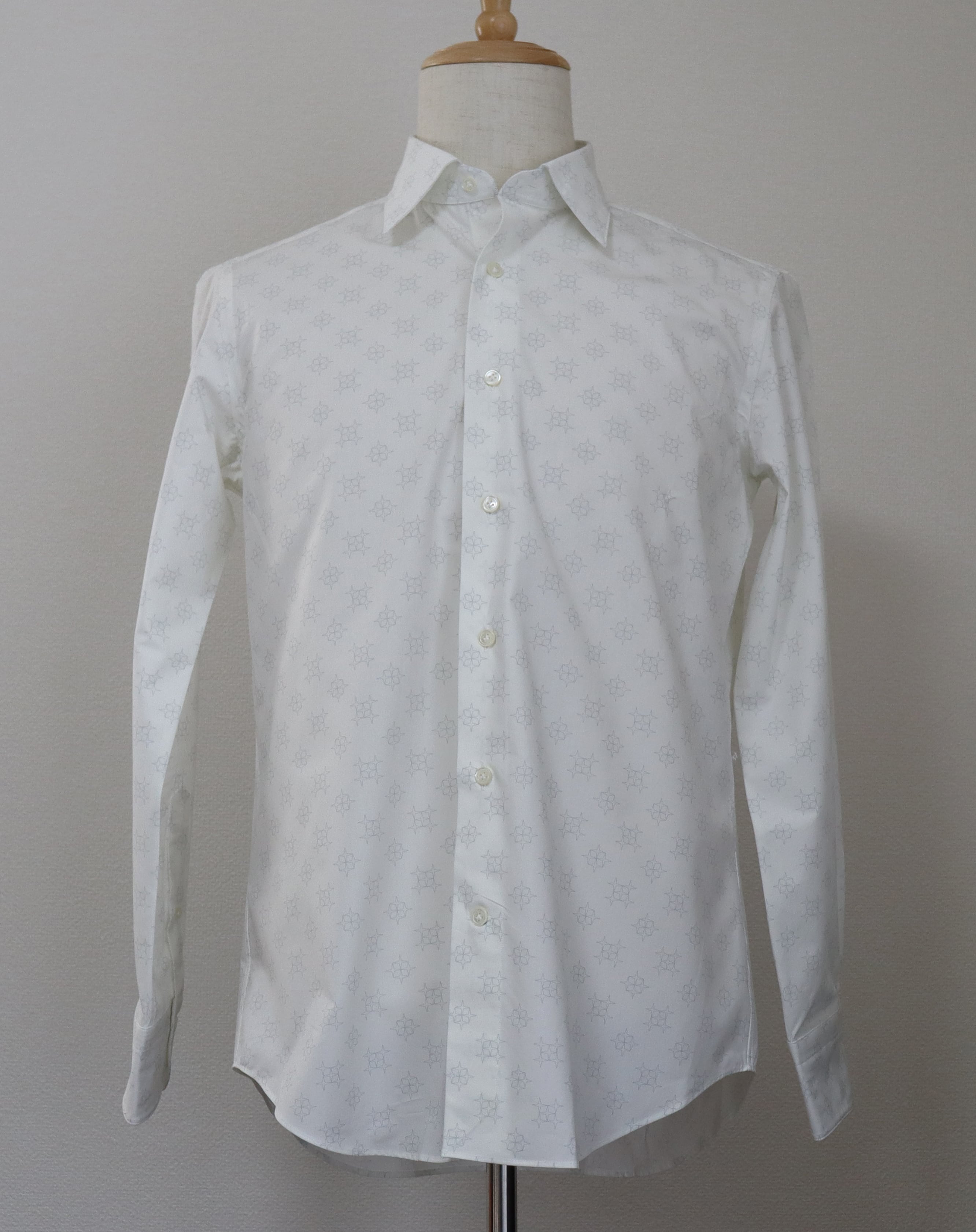 白い生地に、UTINmonogramのライングレーをデザインすると、UTINmonogramがあまり目立たないのですが、上品で高級感のある優雅な印象になりました。ドレスシャツとして慶事などのフォーマルスーツにも合わせることができます。
